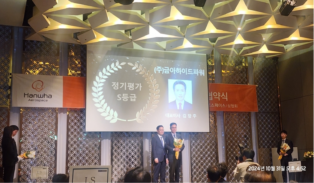 금아하이드파워는 한화에어로스페이스 정기평가 S등급을 받아 우수협력사 수상하였다.